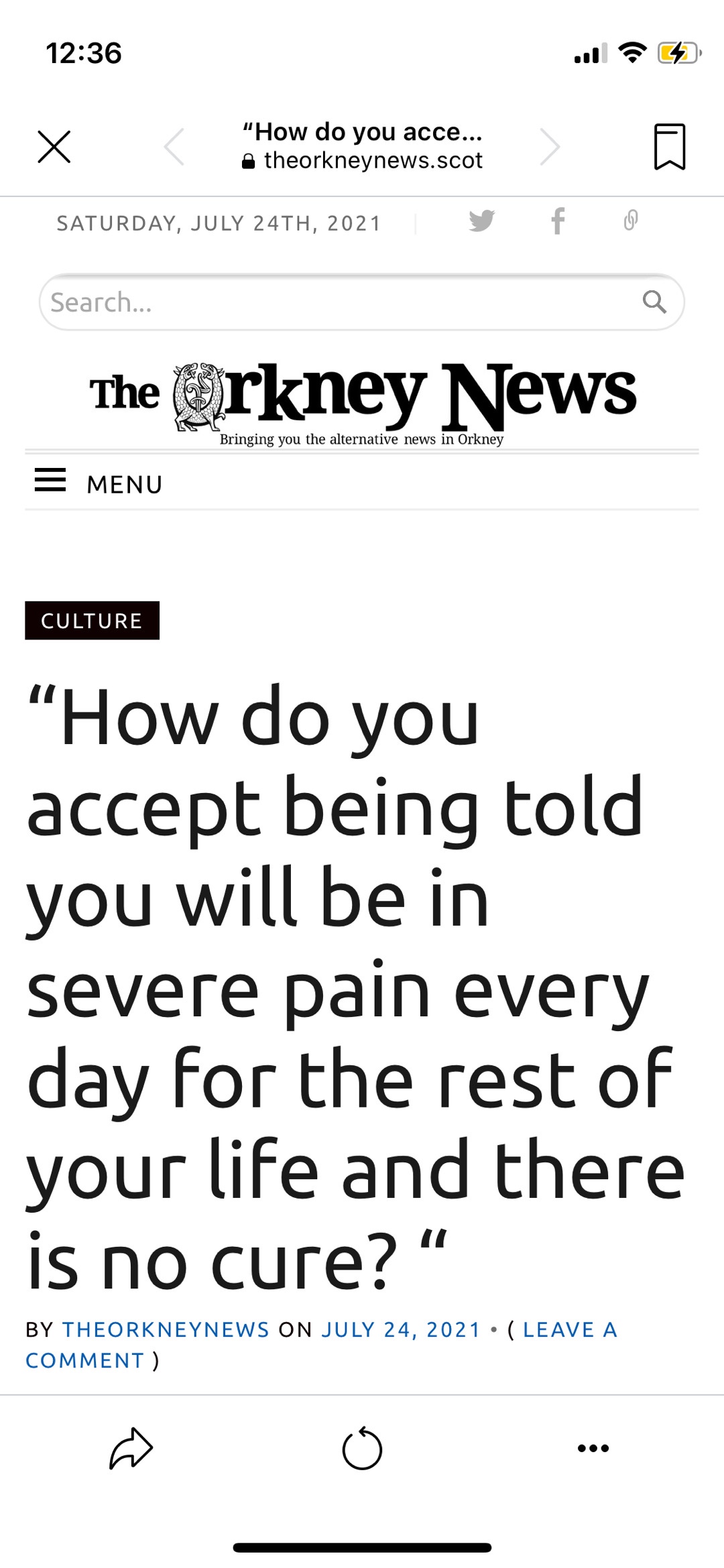 FibromyalgiaOrkney Fibromyalgia Sufferer, article published in The Orkney News, online newspaper 25 July 2021 July 24, 2021July 24, 2021 Orkney Fibromyalgia Sufferer Orkney Fibromyalgia Sufferer. Logo by Tartan Bunnet, Glasgow. Orkney Fibromyalgia Sufferer, article published in The Orkney News, online newspaper 25 July 2021 Share this: Click to share on X (Opens in new window) X Click to share on Facebook (Opens in new window) Facebook Click to share on LinkedIn (Opens in new window) LinkedIn Click to share on Pocket (Opens in new window) Pocket Click to email a link to a friend (Opens in new window) Email Like Loading... Related Published by Orkney Fibromyalgia Sufferer I have suffered with FND, Fibromyalgia and ME/CFS for over a decade. In this blog I write about living with chronic illness and island life in Orkney. View all posts by Orkney Fibromyalgia Sufferer